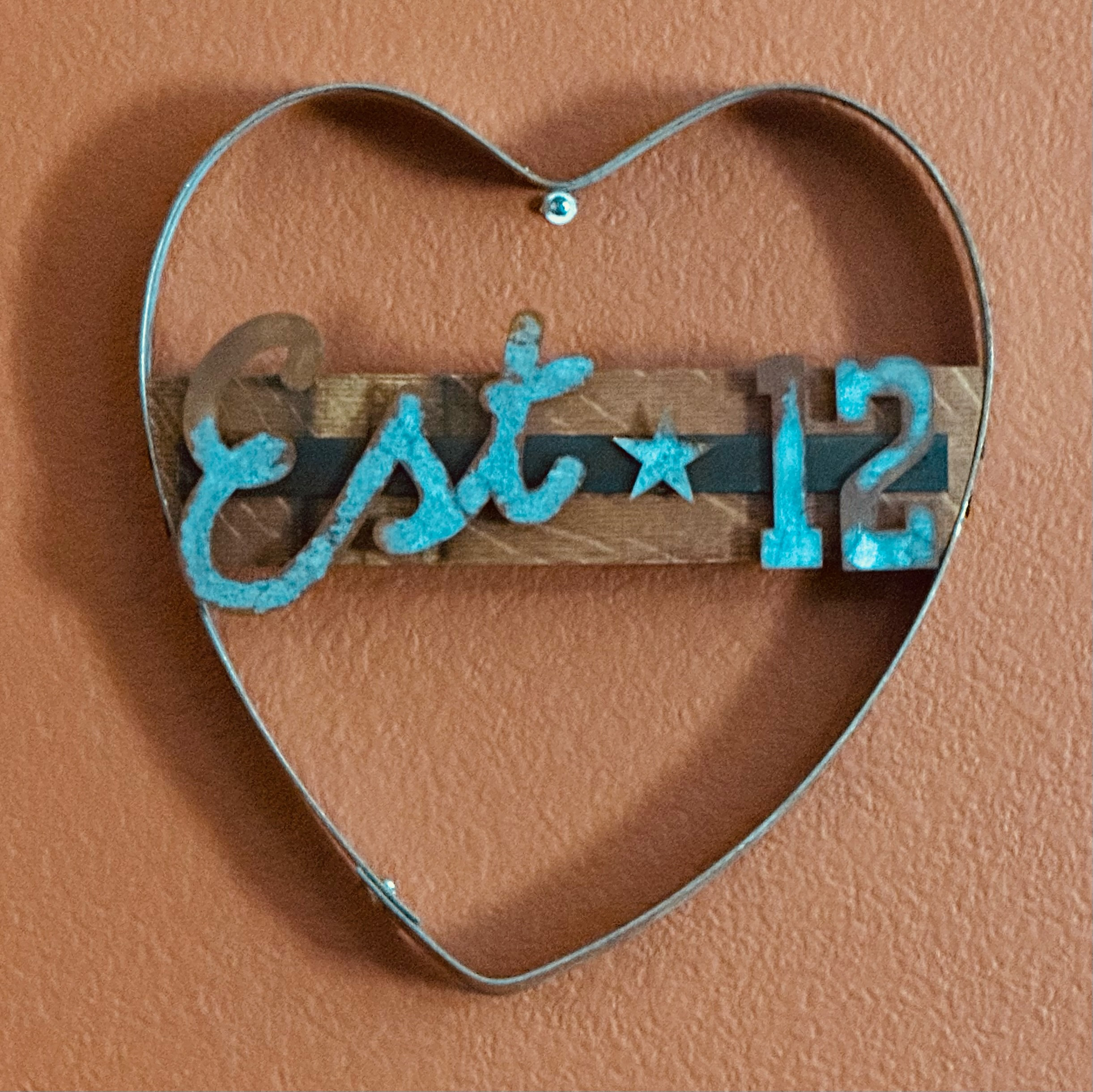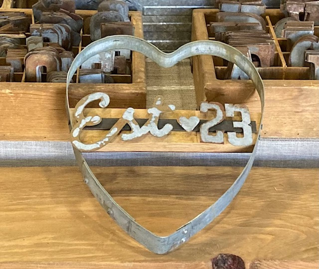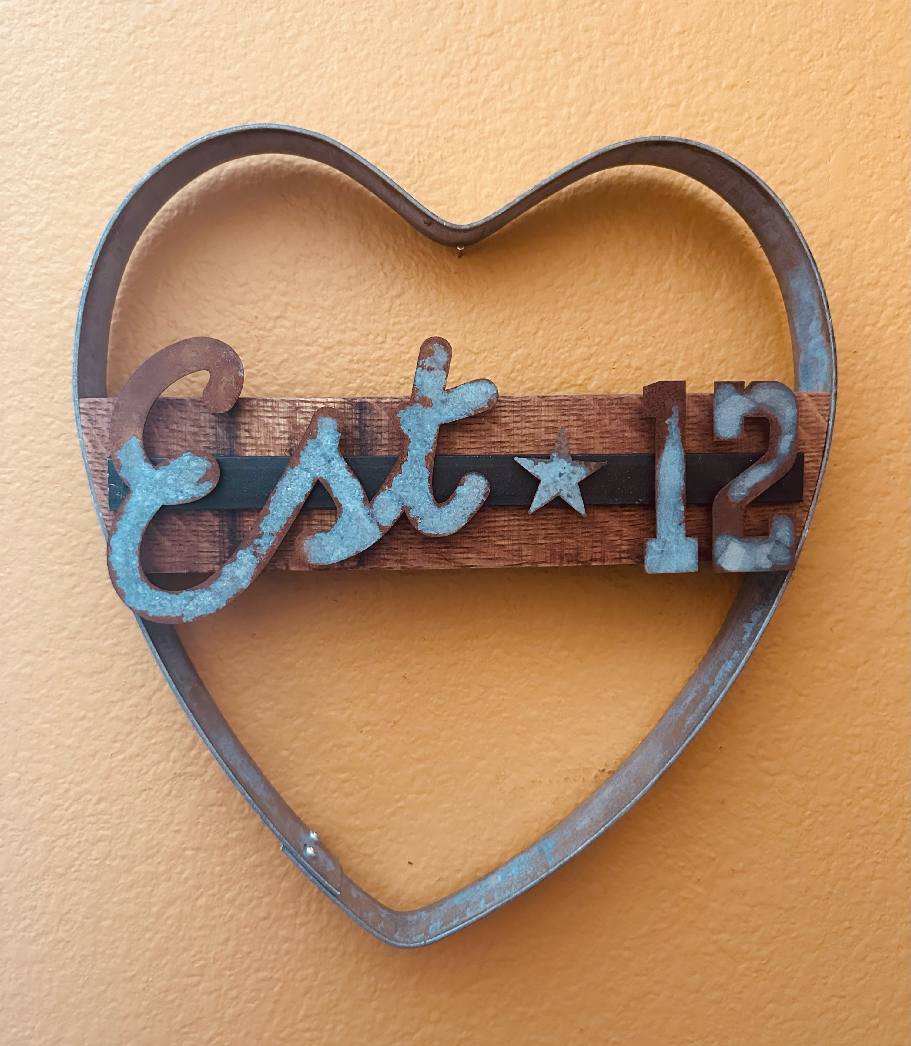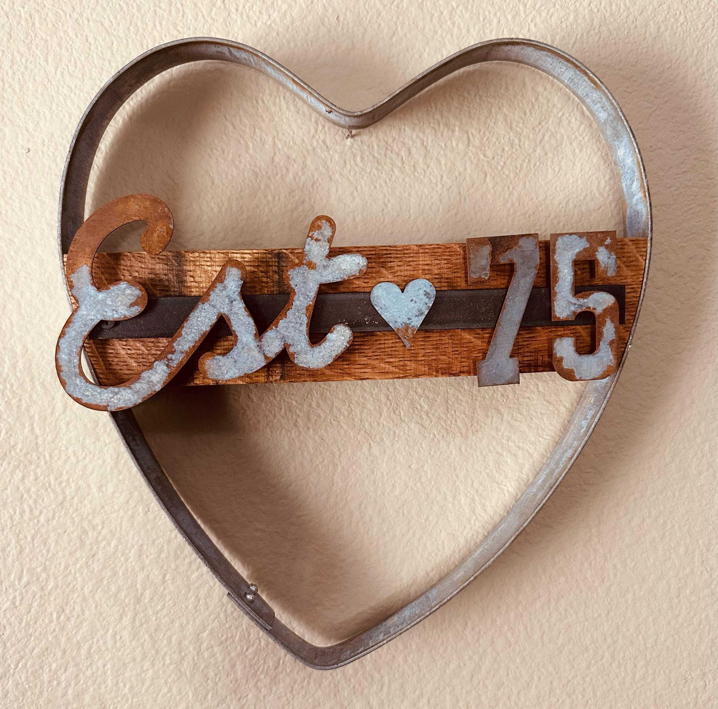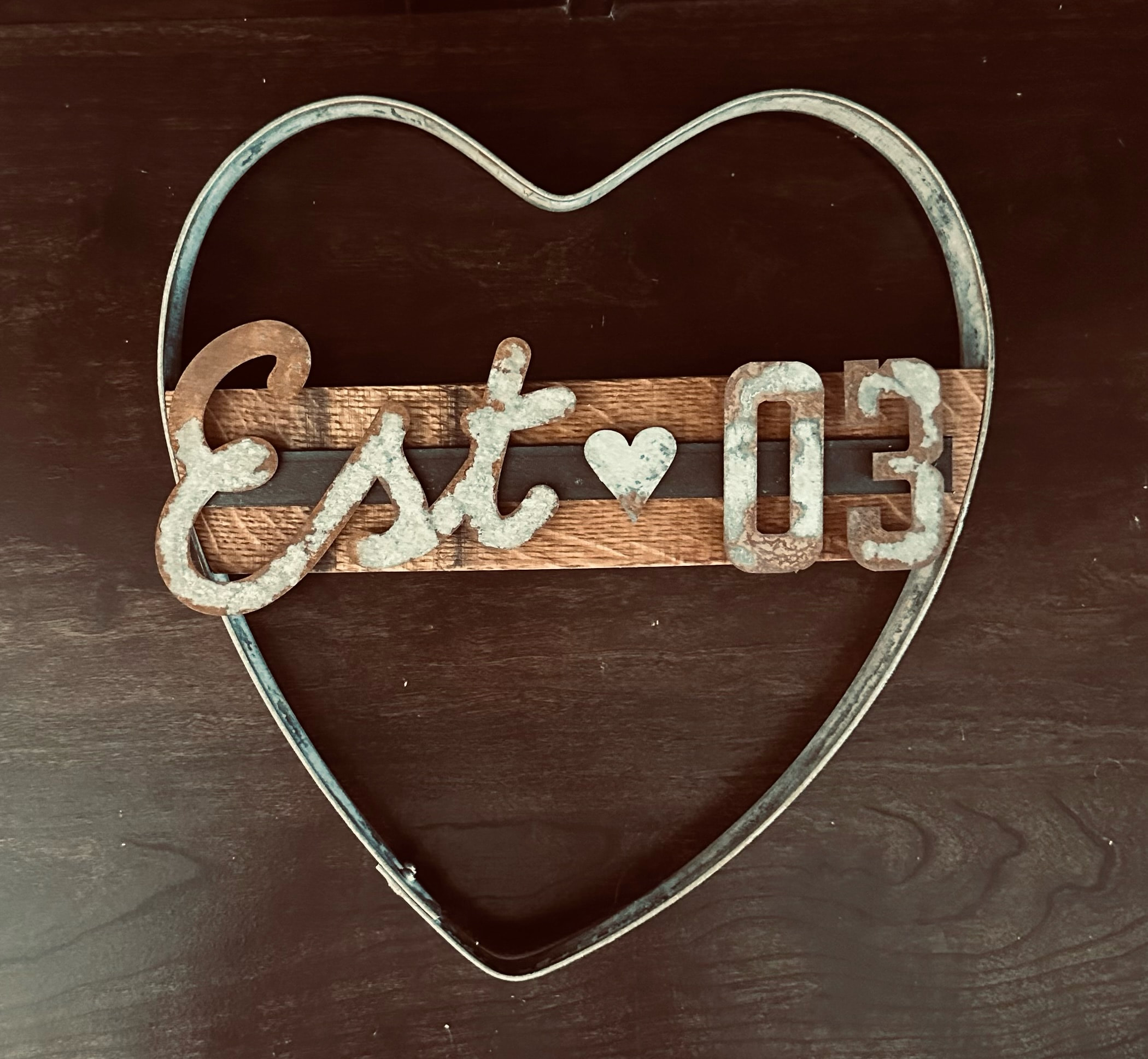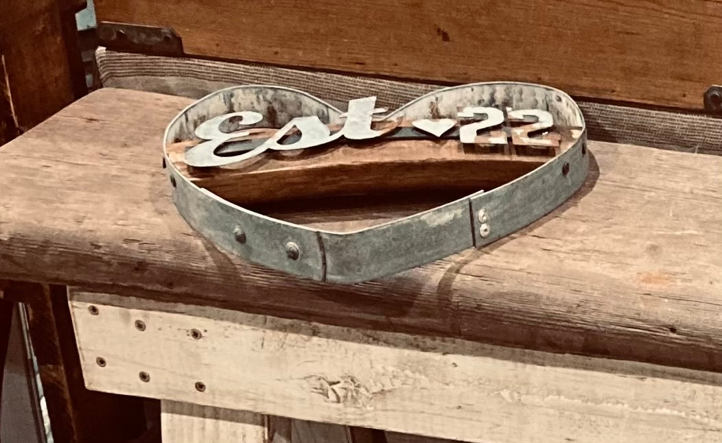 This rustic heart sign is customized with Established and your year. Great for an engagement or wedding gift, purchasing a new home, new baby, starting a new business, birthday or a gift for yourself. Handmade from a wine barrel hoop and stave. Letters are cut from rusted galvanized steel so each item is unique. Letters and numbers are attached with magnets so they can be changed if desired.